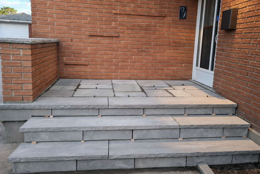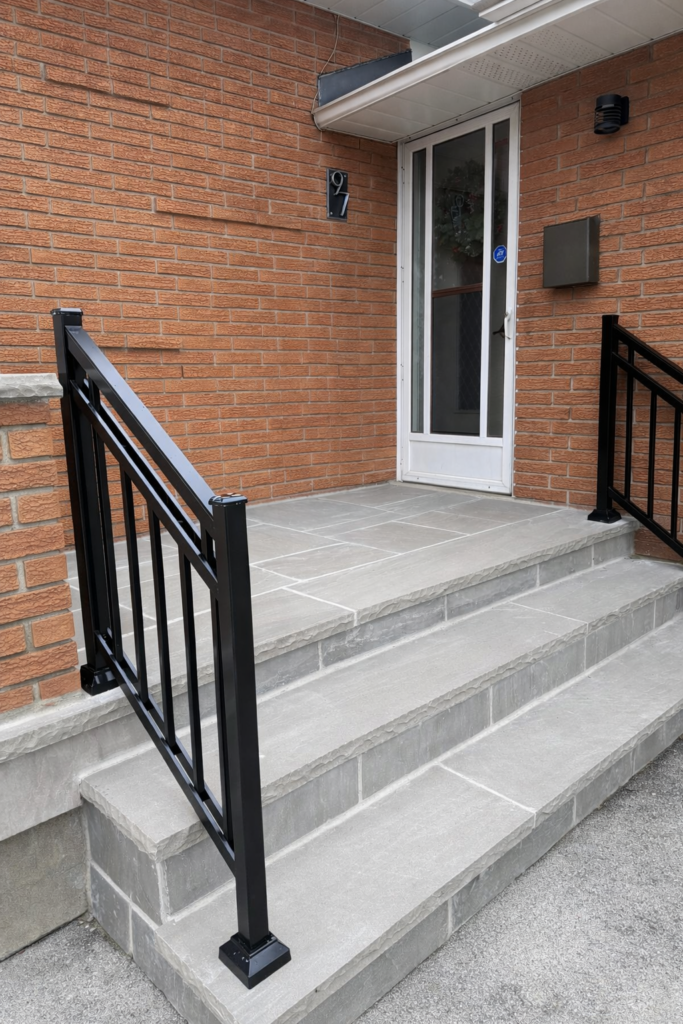 Front Porch Transformation in Mississauga: From Unsafe Precast Steps to Solid Concrete, Flagstone & Black Aluminum Railing