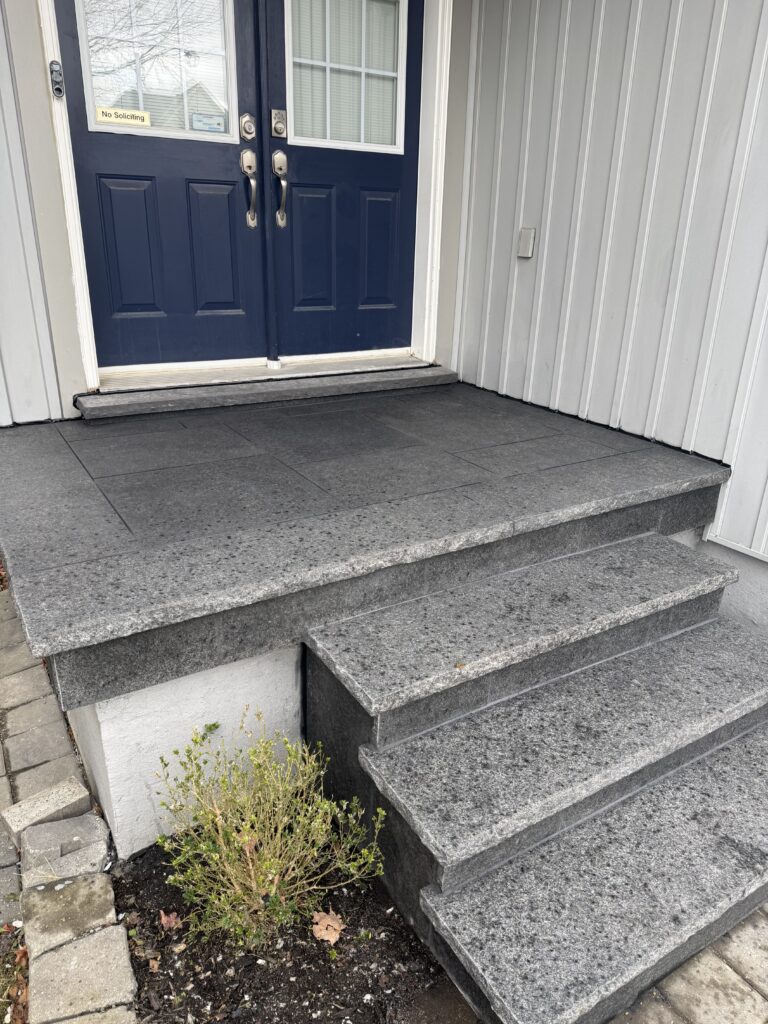 During our consultation, we walked her through different railing options and showed her our full portfolio of completed projects across the GTA. As we talked, she became fascinated with flagstone porches — the texture, the elegance, the transformation they bring to a home’s entrance.