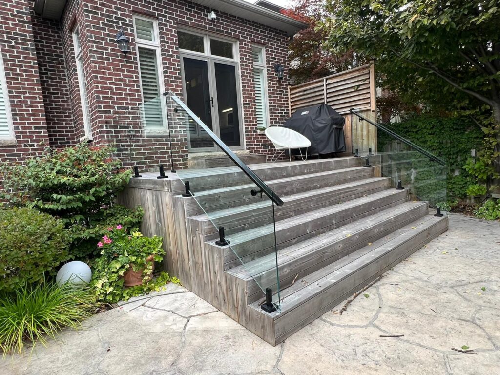 alt="Aluminum and glass railing on deck designed to coordinate with staircase glass handrail installation in Toronto"