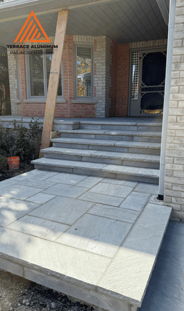 New flagstone porch with aluminum glass railings and aluminum columns in Toronto.